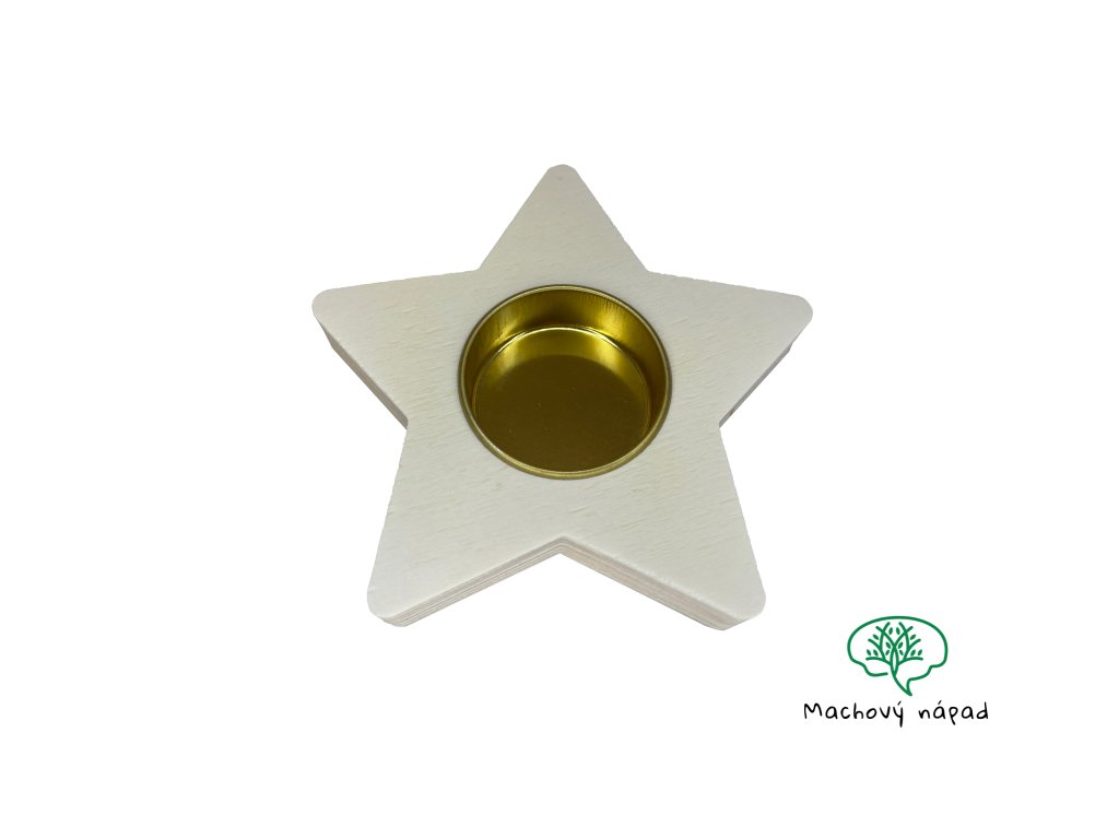 Tento elegantný svietnik v tvare hviezdy je vyrobený z prírodného dreva a vybavený zlatou kovovou miskou na čajovú sviečku. Minimalistický dizajn z neho robí ideálny doplnok do interiéru. Drevený povrch je vhodný aj na ďalšie dekorovanie. Skvelý ako darček alebo ako súčasť tvorivých DIY projektov.