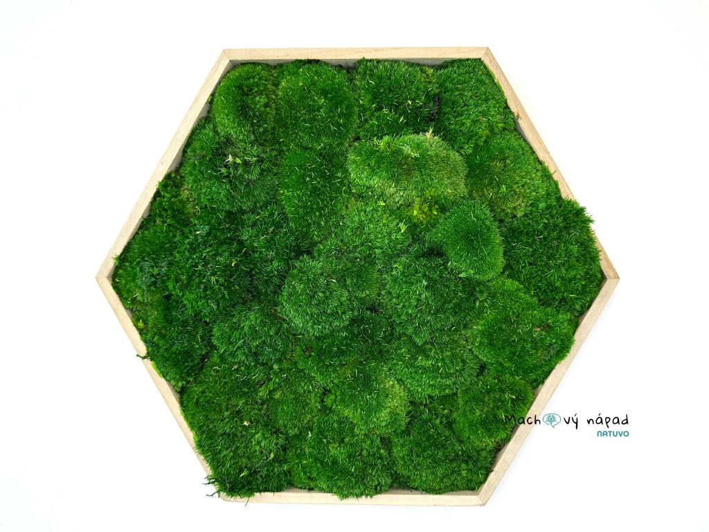 Obraz je osadený do kvalitného dreveného rámu v tvare šesťuholníka, pričom si môžete vybrať z viacerých farebných variantov: hnedá, čierna, biela alebo tmavohnedá. Samotný mach je dostupný v prevedení: bledé kopčeky, tmavé kopčeky alebo farebný MIX, podľa vášho vkusu a interiéru.