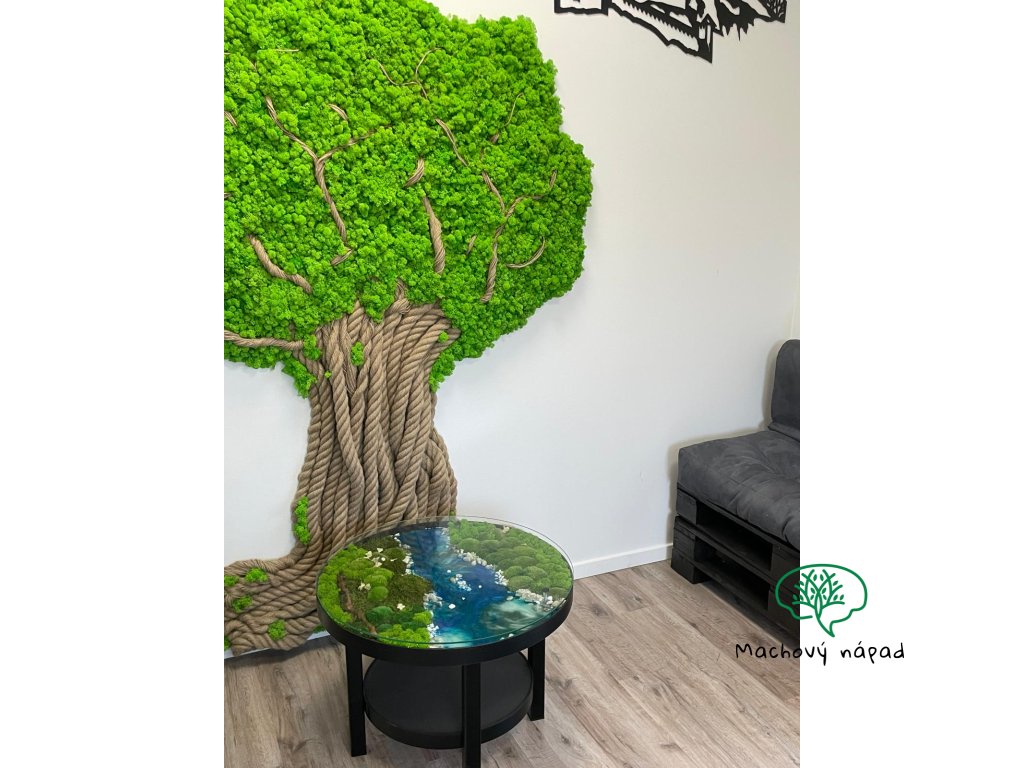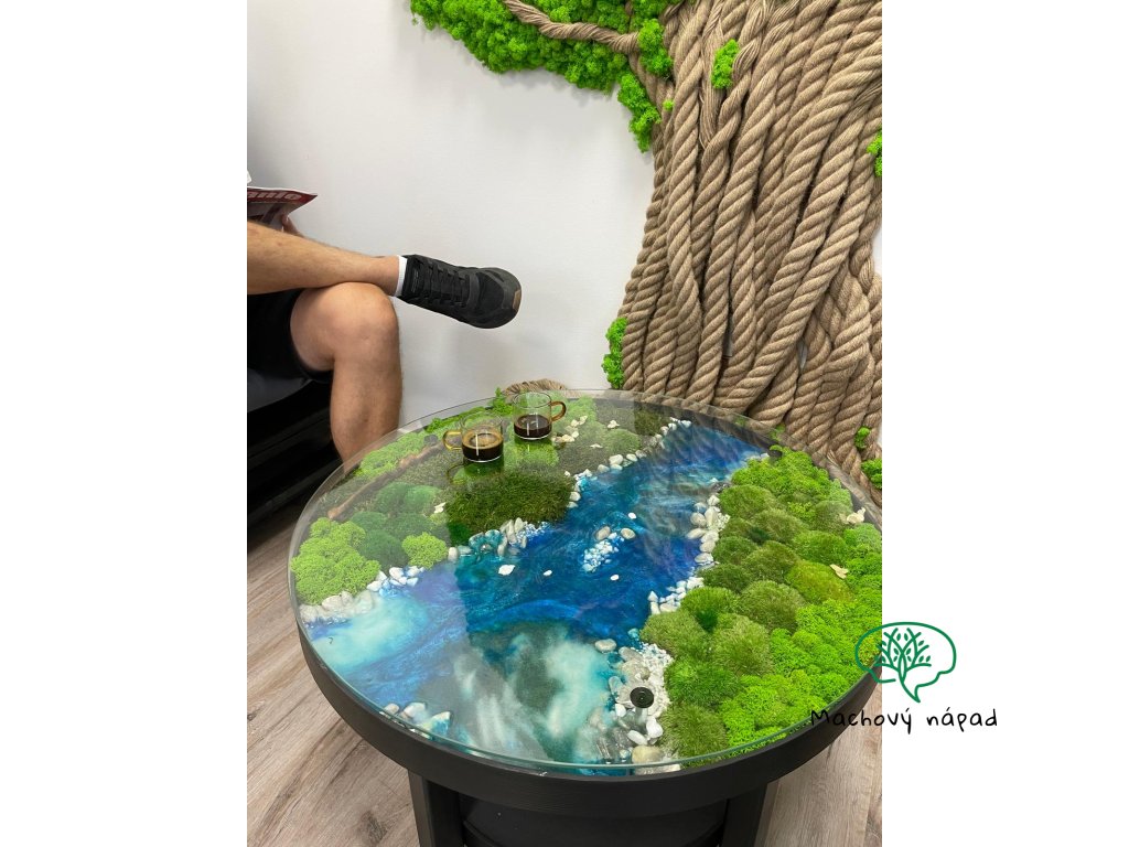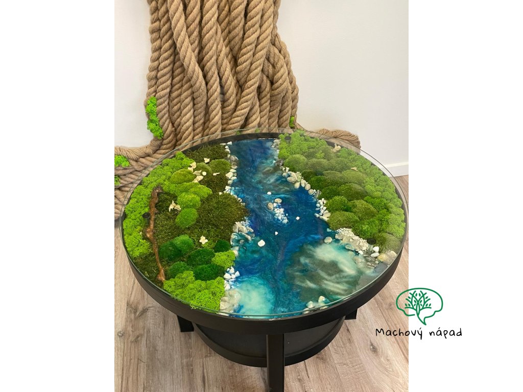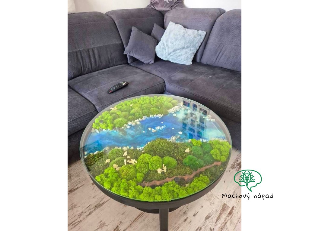 Tento ručný umelecký kúsok je viac než len stôl – je to pohľad do prírody prenesený priamo do vášho interiéru. V srdci stola nájdete stabilizovaný mach, kamienky, drevo a krištáľovo čistú epoxidovú rieku, ktoré spolu vytvárajú dychberúci trojrozmerný efekt.
