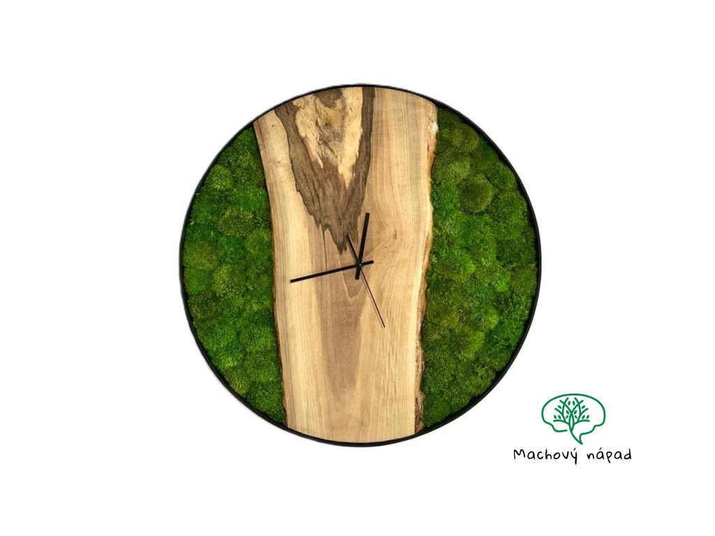 Predná časť hodín je tvorená starostlivo opracovaným kúskom prírodného dreva, ktorého štruktúra a kresba sú ponechané v ich prirodzenej podobe. Každý kus dreva je jedinečný – s vlastnými tónmi, letokruhmi a vzormi, ktoré mu dodávajú osobitosť. Vedľa dreva je osadený stabilizovaný mach, ktorý svojou sýtozelenou farbou a jemnou textúrou vytvára upokojujúci vizuálny efekt pripomínajúci lesný chodník alebo sviežu horskú lúku.