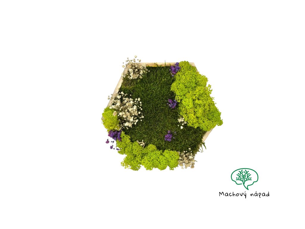 Machový hexagon Ela – spája krásu prírody s nadčasovým dizajnom. Tento unikátny obraz je vyrobený z ručne aranžovaného stabilizovaného plochého machu, lišajníka a doplnený sušenými kvetmi, ktoré mu dodávajú jemnosť a romantický nádych.