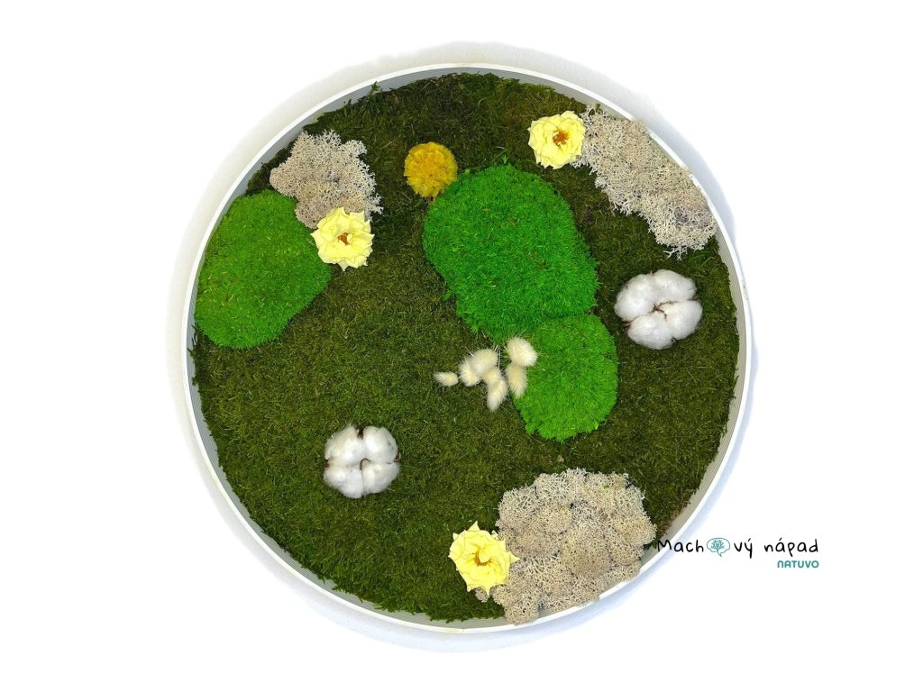 Obraz so stabilizovaným machom, stabilizovanými rastlinami a kvetmi" je výnimočným umeleckým dielom a zároveň dekoračným prvkom, ktorý kombinuje rôzne stabilizované prírodné materiály. Stabilizovaný mach, stabilizované rastliny a kvety sú všetky materiály, ktoré prešli procesom stabilizácie, aby si zachovali svoj pôvodný vzhľad a štruktúru, ale nebolo potrebné ich zalievať alebo udržiavať.