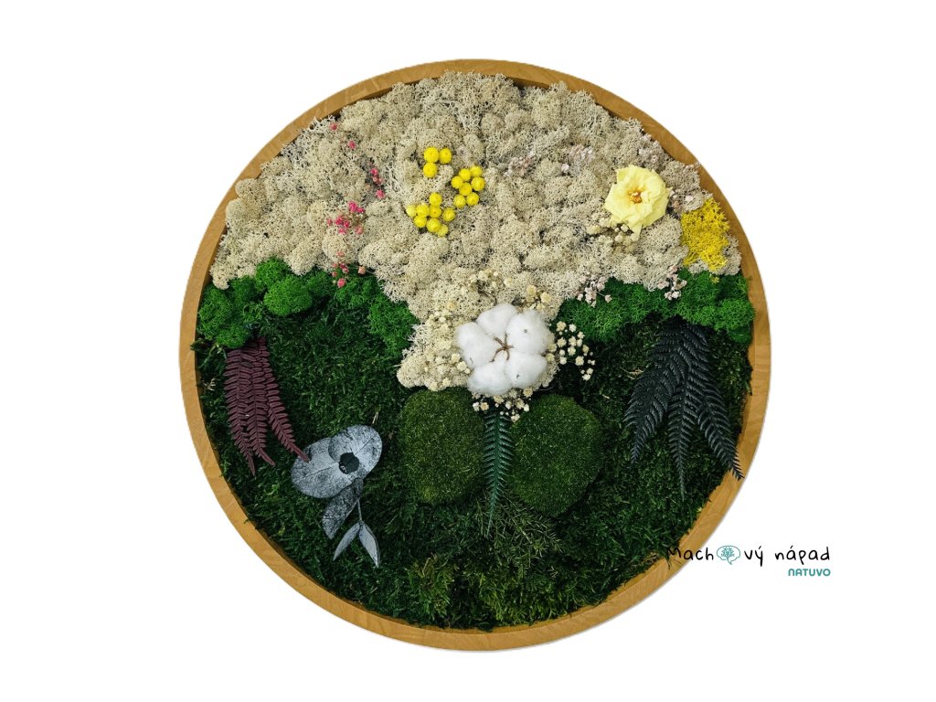 Obraz so stabilizovaným machom, stabilizovanými rastlinami a kvetmi je výnimočným umeleckým dielom a zároveň dekoračným prvkom, ktorý kombinuje rôzne stabilizované prírodné materiály. Stabilizovaný mach, stabilizované rastliny a kvety sú všetky materiály, ktoré prešli procesom stabilizácie, aby si zachovali svoj pôvodný vzhľad a štruktúru, ale nebolo potrebné ich zalievať alebo udržiavať.