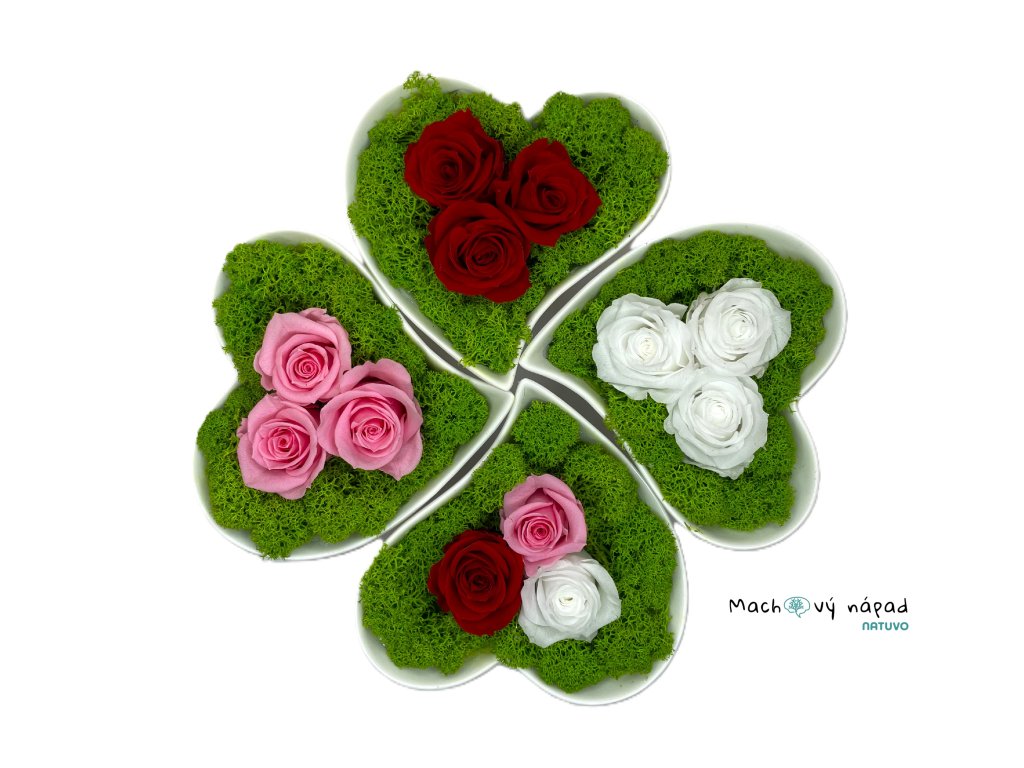 Pôsobí v miestnosti moderne, nadčasovo a do interiéru prinesie pozitívnu atmosféru. Ponúkame ho veľkosti 12x12x6cm a v bielej farbe (porcelán) v tvare srdca so stabilizovanými ružami a stabilizovaným lišajníkom. Každý výrobok je originálny a vyrobený ručne na slovensku.