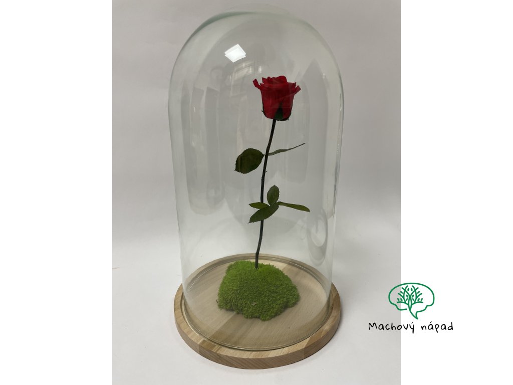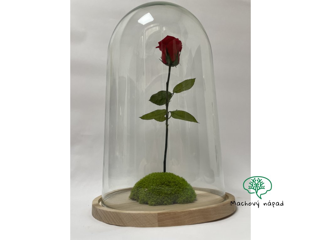 V srdci kopule stojí jediná, no o to výraznejšia červená ruža – je stabilizovaná, aby si zachovala svoju krásu a čerstvosť aj niekoľko rokov. Jemný stabilizovaný mach na drevenej podložke dotvára harmonický kontrast farieb a pôsobí ako zelený ostrovček života.